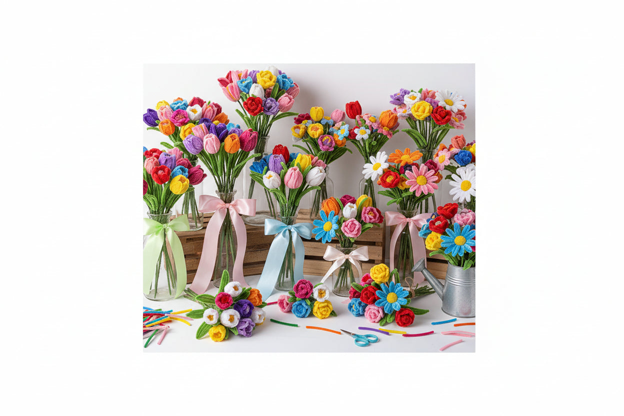 wiwbbitl 400 Pcs Pipe Cleaners Craft Set - 4 Colors Chenille Stems (11.8"x0.23") for DIY Flowers, Bouquets, Kids' Art & Home Crafts. Includes 30-Yard Green Tape, Ribbon, Glue Sticks, Rods & Stamen